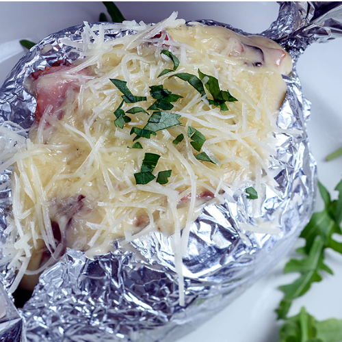 γεμιστή με ζαμπόν, μπέικον, κρέμα γάλακτος και πεκορίνο