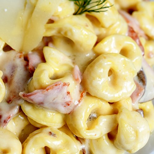 Τορτελίνι με γέμιση τυριού, μπέικον, σάλτσα ντομάτας, κρέμα γάλακτος