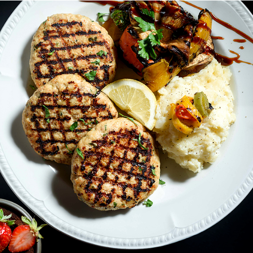 μπιφτεκάκια από φρέσκο κιμά κοτόπουλου ψημένα στο grill συνοδεύονται με πουρέ φρέσκιας πατάτας