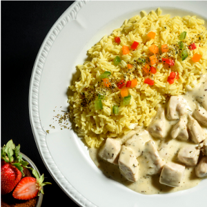 φιλέτο κοτόπουλο, με σως λεμονιού, ρίγανη, κρέμα γάλακτος συνοδεύεται με αρωματικό ρύζι